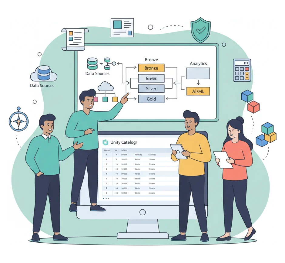 - Data Governance Framework: Implementing Unity Catalog with comprehensive lineage, access controls, and data discovery capabilities.