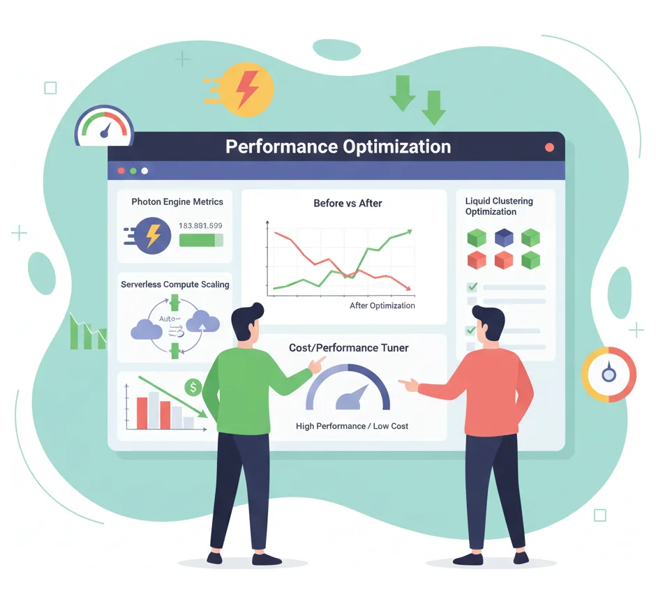 Our platform implementations are optimized specifically for Databricks, leveraging advanced features like the Photon engine, serverless compute, and Delta Lake liquid clustering. We ensure maximum performance and cost efficiency through platform-native capabilities that lower your TCO.