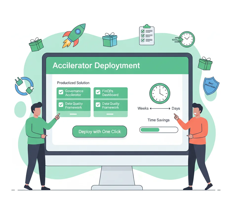 We productize our expertise into proven frameworks and accelerators that automate critical, high-value functions. Our accelerators for Unity Catalog setup, automated data quality frameworks, and FinOps dashboards provide immediate control over your data and costs, ensuring your platform is both powerful and efficient from day one.